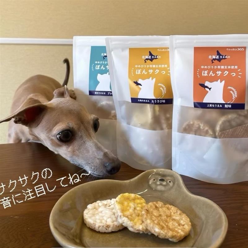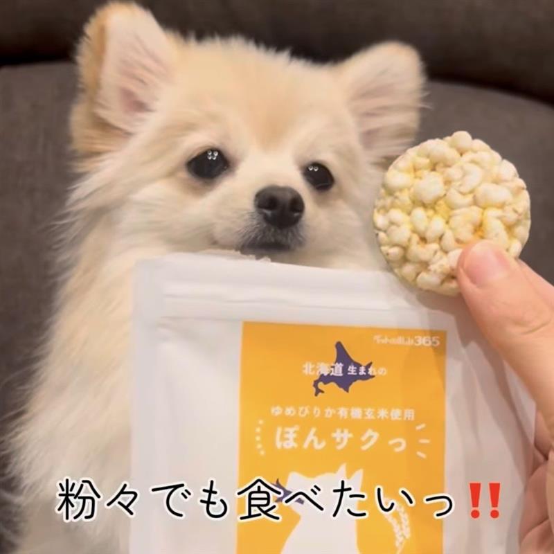 ぽんサクっは、北海道産の有機玄米を使用したゆめぴりかと鮭節だけで作られています🐟油を使わない独自製法でつくった犬用ポン菓子!化学調味料・保存料・着色料不使用なので安心して食べられるね🙆♀️
