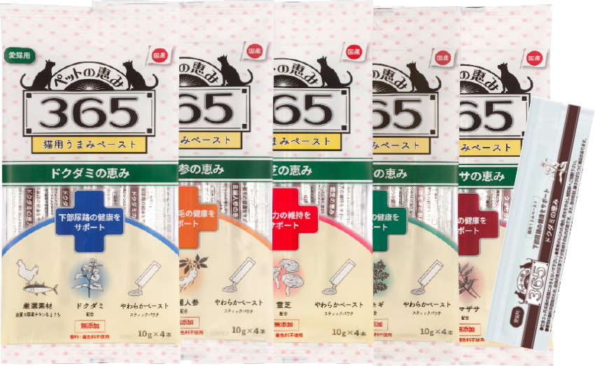 下部尿路・皮膚被毛・免疫力・口腔内・腎臓など、愛猫の気になるお悩みに合わせて選べるペーストタイプのおやつです。