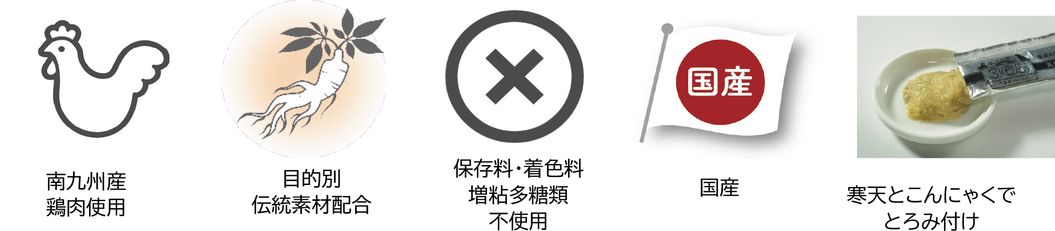 高麗人参などの伝統素材をお悩みごとに組み合わせ、国産素材を使用。寒天とこんにゃくで自然なとろみをつけ、1本1本ていねいに仕上げました。